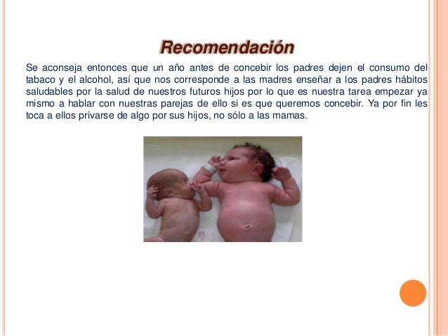 Cuando está embarazada es importante que preste atención a lo que pone en su cuerpo. Evite el uso de alcohol las drogas y el tabaco mientras está embarazada porque todos le afectan a usted tanto como a su bebé. 10 Además es posible que el bebé desarrolle dependencia de los opioides u otras drogas que haya consumido la madre durante el embarazo una afección que se conoce como síndrome de abstinencia neonatal SAN. Cuando la mayoría de las personas escuchan el término salud antes del embarazo piensan en las mujeres. Hay cosas que los hombres pueden hacer por su propia salud así como por la de las mujeres y niños en sus vidas. Algunas drogas pueden causar abstinencia en el bebé inmediatamente después del parto. Pero siempre son perjudiciales tanto las que son permitidas como las que no. Es un grupo de trastornos de salud que el bebé puede tener si la madre usa drogas adictivas durante el embarazo. Cuando está embarazada es importante que preste atención a lo que pone en su cuerpo.